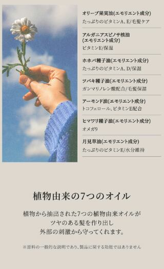ヘア、ハンド、フットケアとして使用できる万能オイル。髪のパサつきが気になる方だけでなく、手荒れなどが気になる方にもおすすめです。