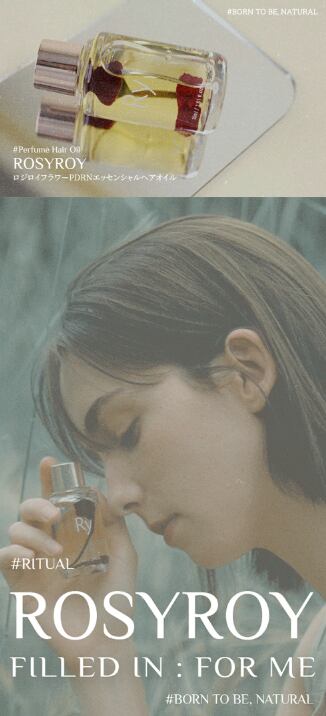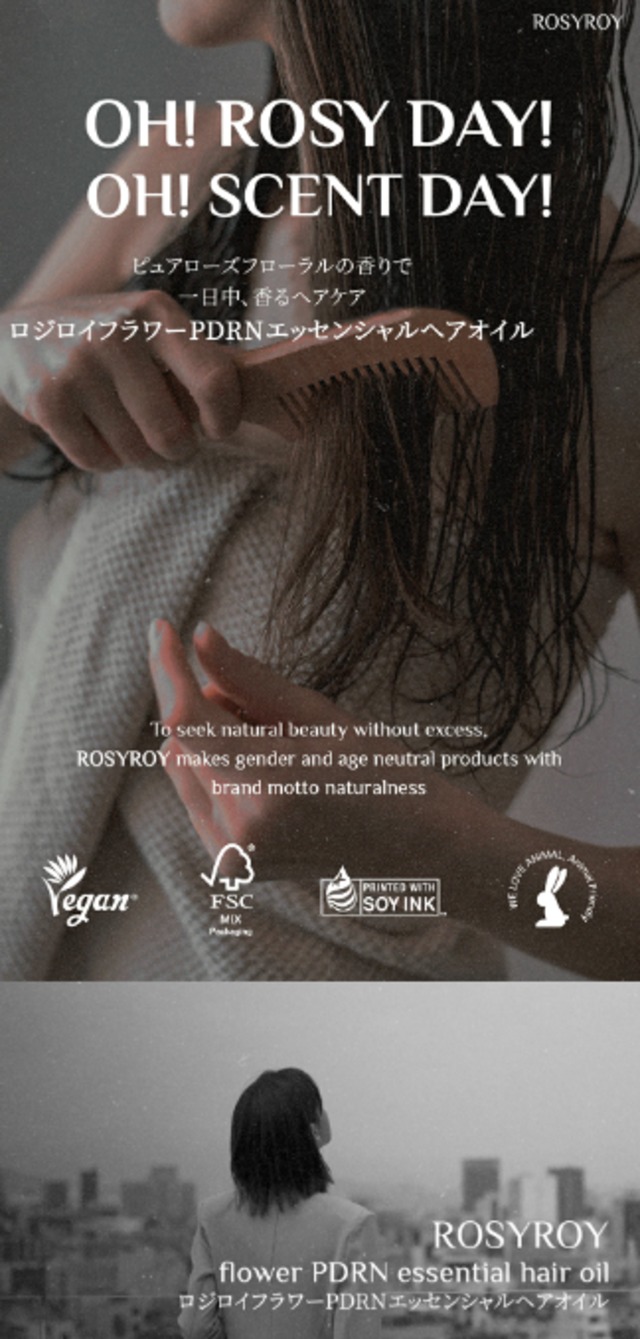 ROSYROYヘアオイルは、自然由来の成分をたっぷりと配合し、軽いテクスチャーでべたつきにくく、さらっとした使い心地が特徴です。