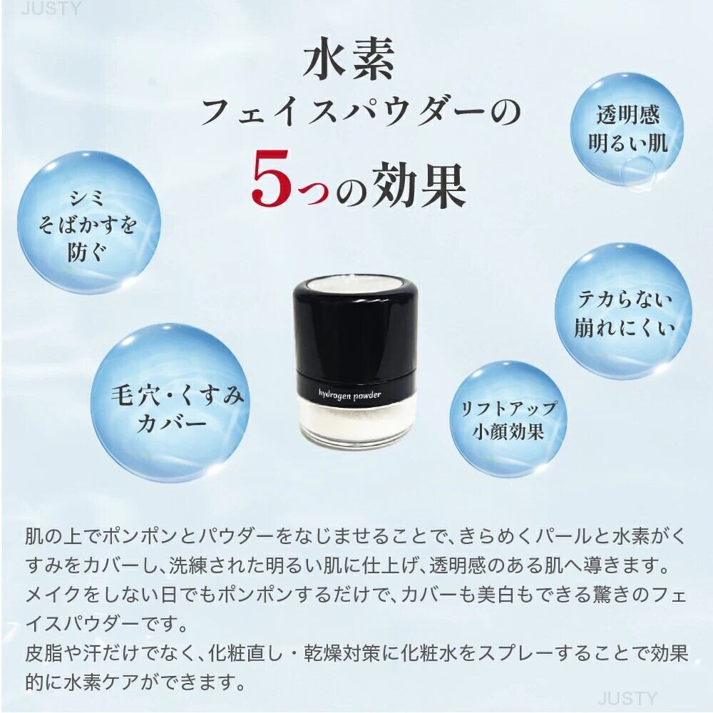 水素フェイスパウダーは、水素の力を活かした全く新しいスキンケア製品です。肌の内側から潤いを引き出し、明るさを与えるサポートをします。