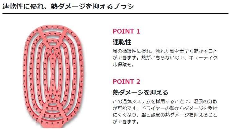 1. ブラシ機能:髪を整えるための基本的なブラシ機能をのCの形状で向上。平面のない頭部のどこにあててもフィットします。適度に弾力のあるピンが髪を引っ張らず解いていきます。