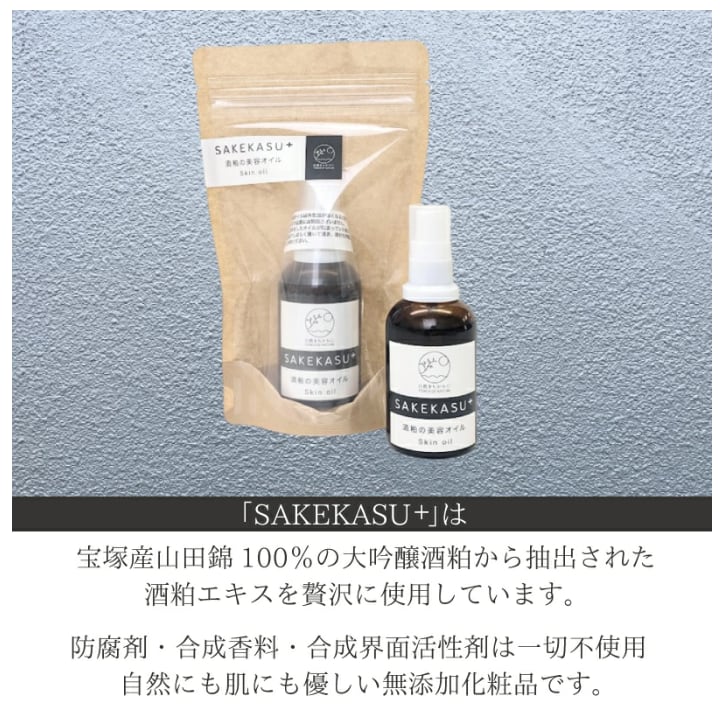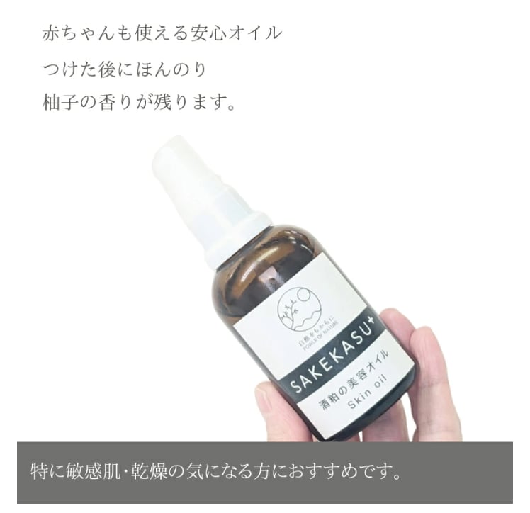 兵庫県宝塚産大吟醸酒粕を贅沢に使用し、酒粕の持つ効果を活かした無添加の美容オイルです。