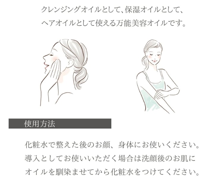 化粧水で整えた後のお顔、身体、髪にお使いください。