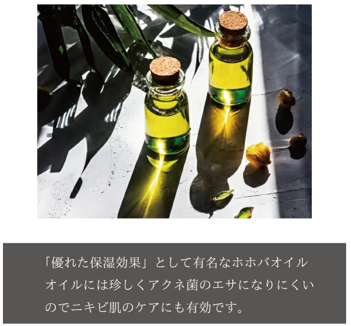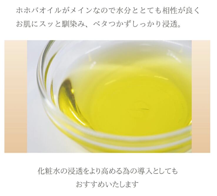 ホホバオイルは分子構造が小さいので化粧水の浸透をより高める為の導入としてもお使いいただけます。