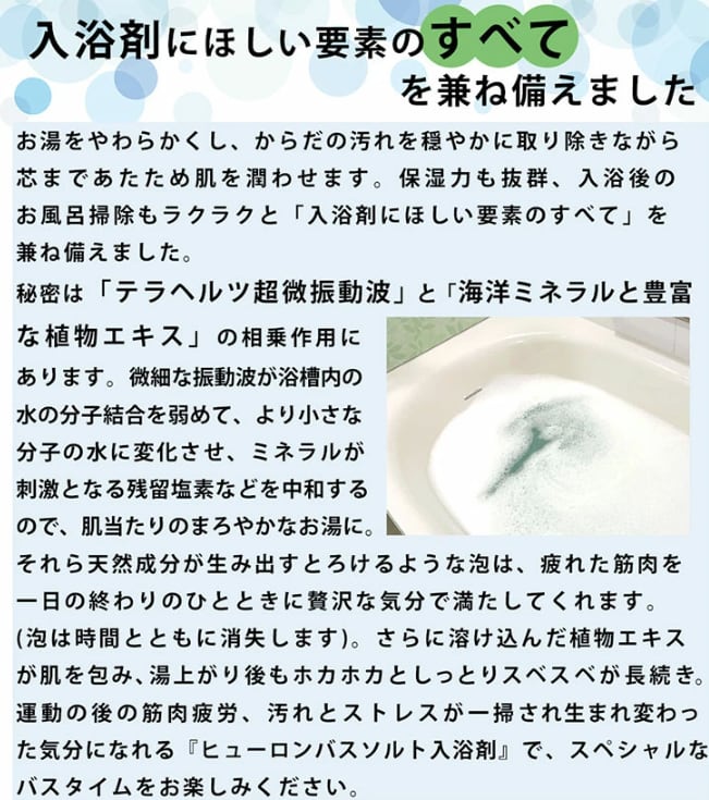 この【ヒューロンバスソルト】で、ゆったりとした入浴時間を満喫し、心も体もリフレッシュしましょう!